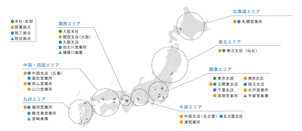 | 営業所 | 札幌営業所営業施工 〒060-0061 北海道札幌市中央区南1条西11丁目327 一条ビル3階MAP 水戸営業所営業 高崎営業所営業 津営業所営業 加古川営業所施工 高松営業所施工 岡山営業所営業施工 山口営業所営業 福岡営業所営業施工 鹿児島営業所施工 |