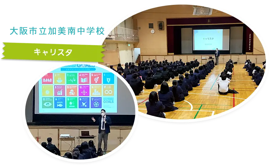 2020年12月に大阪市立加美南中学校でキャリアスタディを実施しました。本来キャリスタは、企業から出された課題に対して生徒が取り組んでいくキャリア教育のプログラムですが、2020年度は「地球環境とキャリア」をテーマに50分の講演をおこないました。