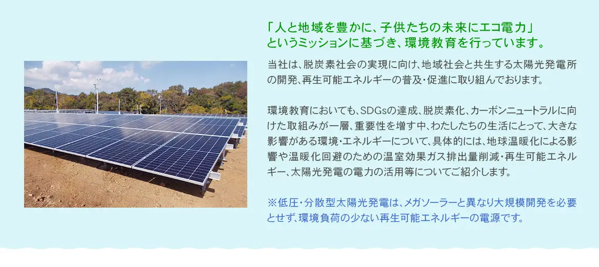 「キャリア教育」として、当社の事業、地域貢献も含めた再生可能エネルギーの普及・促進の取組みについて紹介すると共に、関連して、地球温暖化の仕組み等、環境やエネルギーに関する内容などについて授業を行いました。