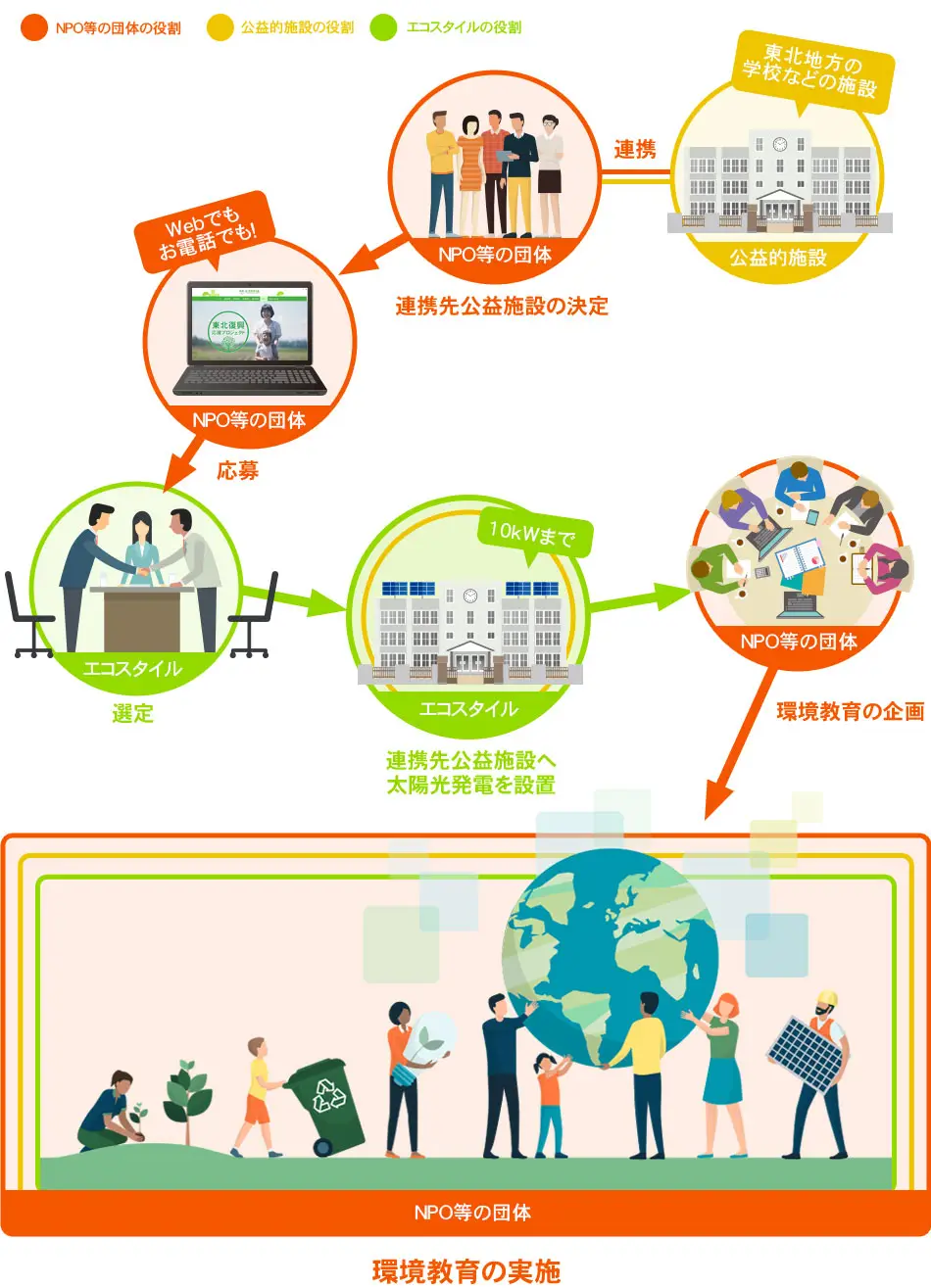 その後、太陽光発電設備を設置した施設とエコスタイル及びNPO等の団体とが連携・協働して環境活動を行うことで、地域環境活動の活性化を図ります。