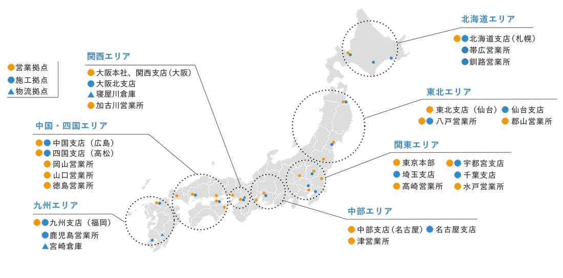 | 営業所 | 札幌営業所営業施工 〒060-0061 北海道札幌市中央区南1条西11丁目327 一条ビル3階MAP 水戸営業所営業 高崎営業所営業 津営業所営業 加古川営業所施工 高松営業所施工 岡山営業所営業施工 山口営業所営業 福岡営業所営業施工 鹿児島営業所施工 |