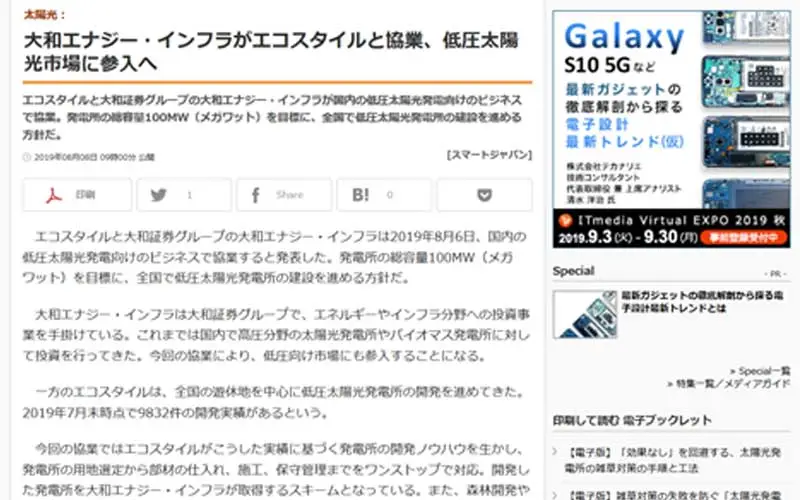 【スマートジャパンHP掲載】エコスタイルと大和エナジー・インフラと協業、低圧太陽光市場に参入へ