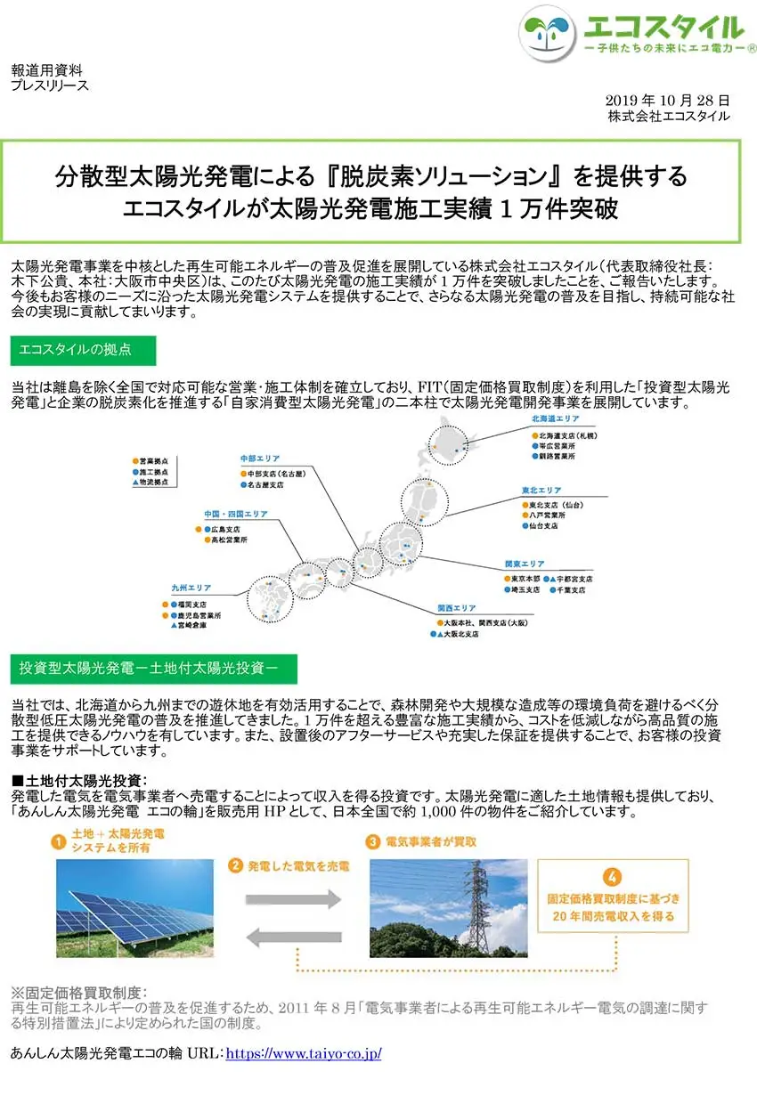 分散型太陽光発電による 『脱炭素ソリューション』 を提供する エコスタイルが太陽光発電施工実績1万件突破