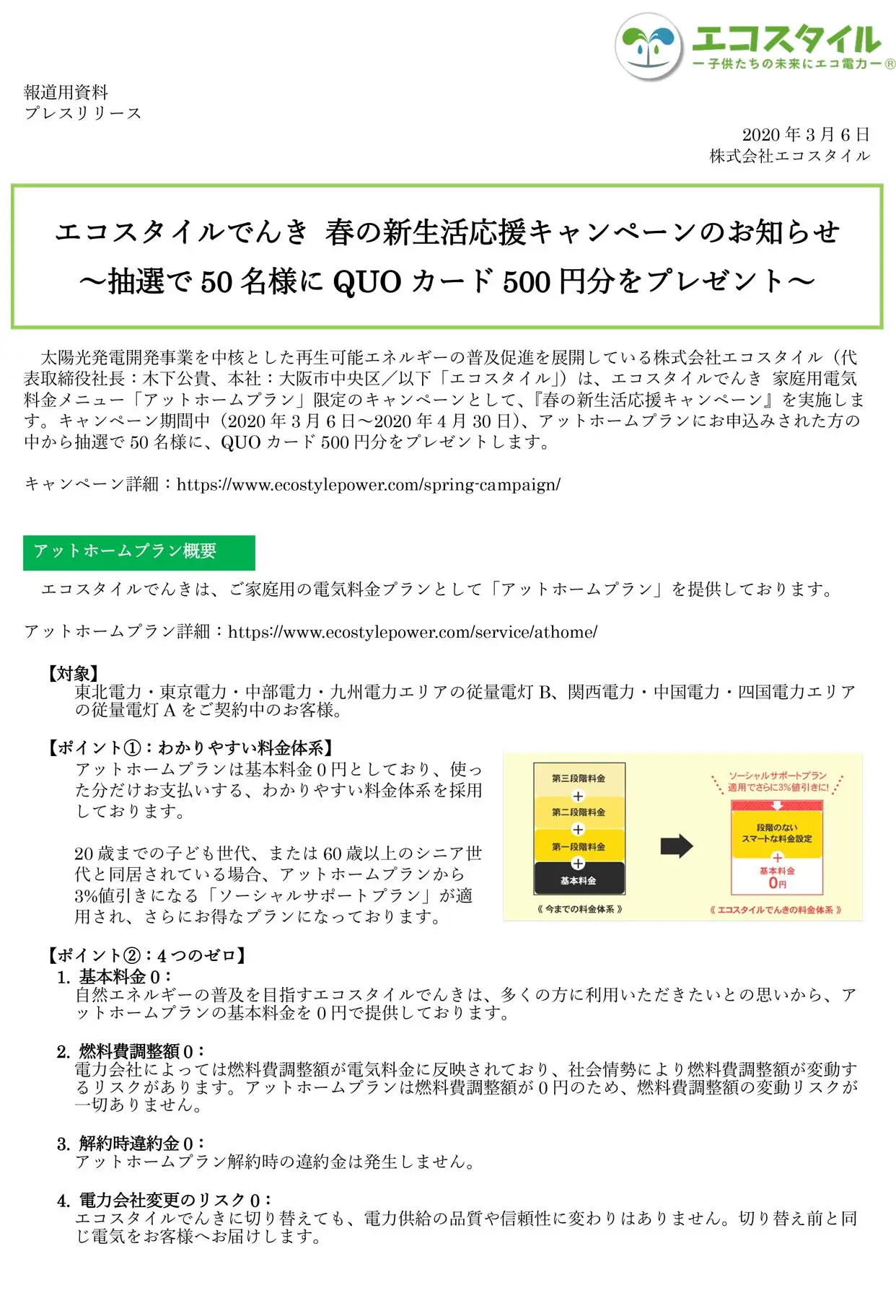 エコスタイルでんき 春の新生活応援キャンペーンのお知らせ ~抽選で50名様にQUOカード500円分をプレゼント~