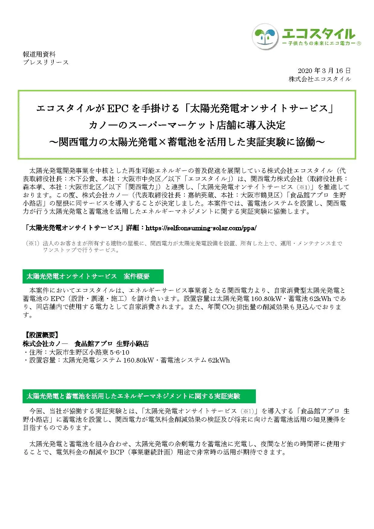 エコスタイルがEPCを手掛ける「太陽光発電オンサイトサービス」カノ―のスーパーマーケット店舗に導入決定~関西電力の太陽光発電×蓄電池を活用した実証実験に協働~