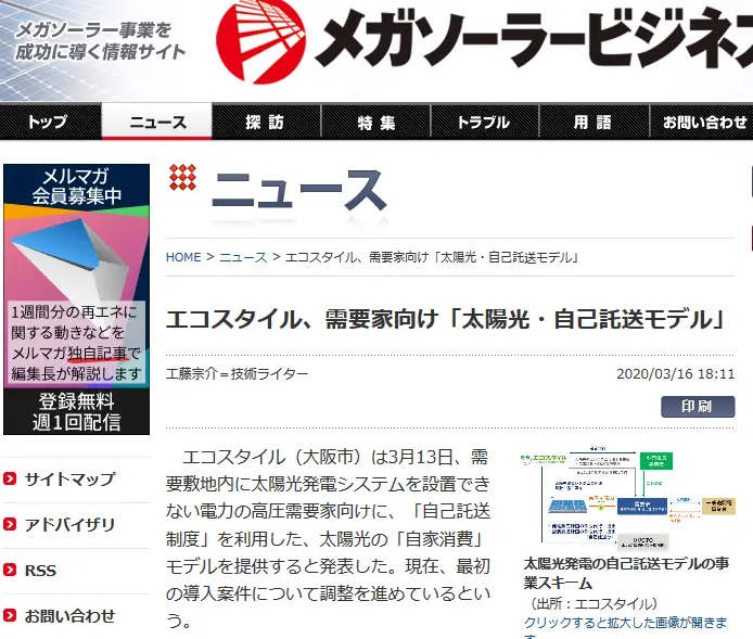 【メガソーラービジネス掲載】エコスタイル、需要家向け「太陽光・自己託送モデル」
