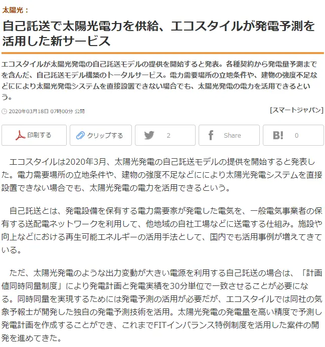 【スマートジャパンHP】自己託送で太陽光電力を供給、エコスタイルが発電予測を活用した新サービス