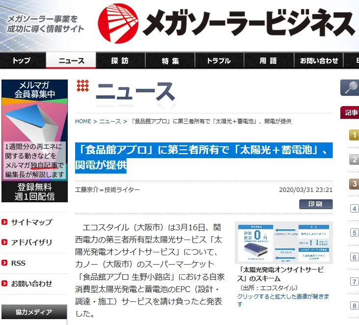 【メガソーラービジネス掲載】「食品館アプロ」に第三者所有で「太陽光+蓄電池」、関電が提供