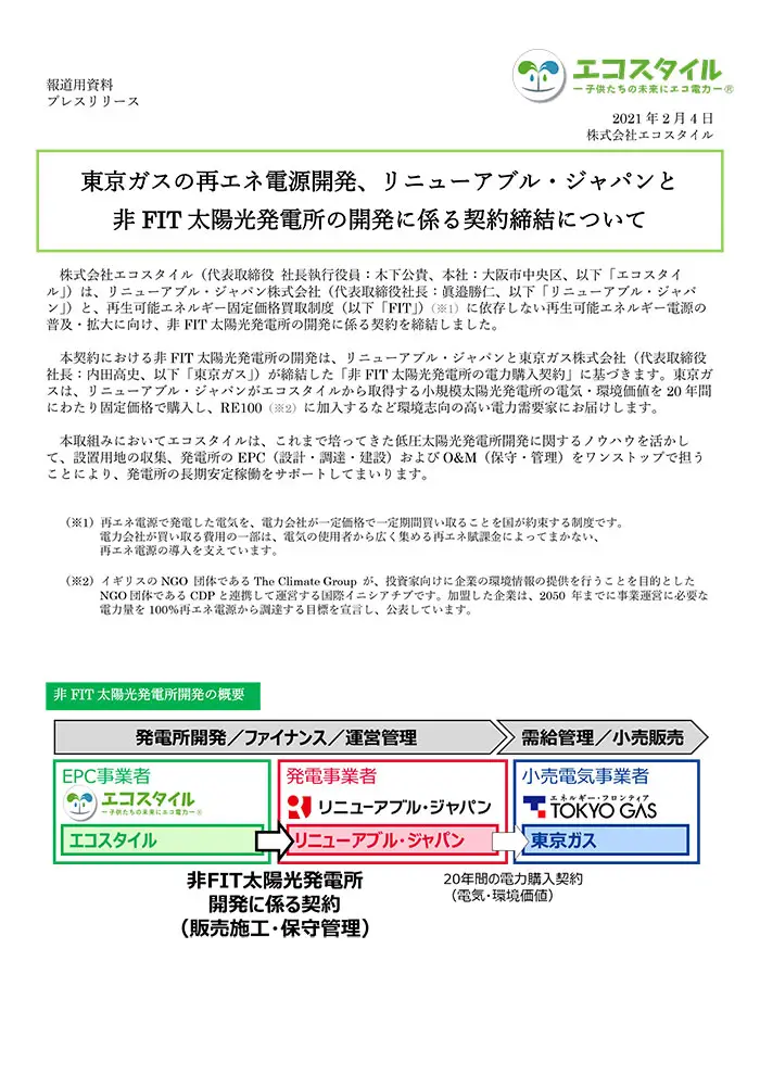 東京ガスの再エネ電源開発、リニューアブル・ジャパンと 非FIT太陽光発電所の開発に係る契約締結について