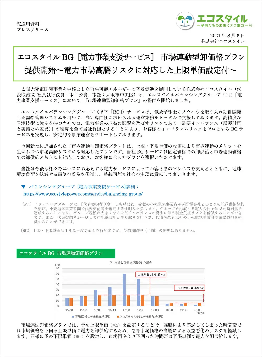 エコスタイルBG [電力事業支援サービス] 市場連動型卸価格プラン提供開始~電力市場高騰リスクに対応した上限単価設定付~