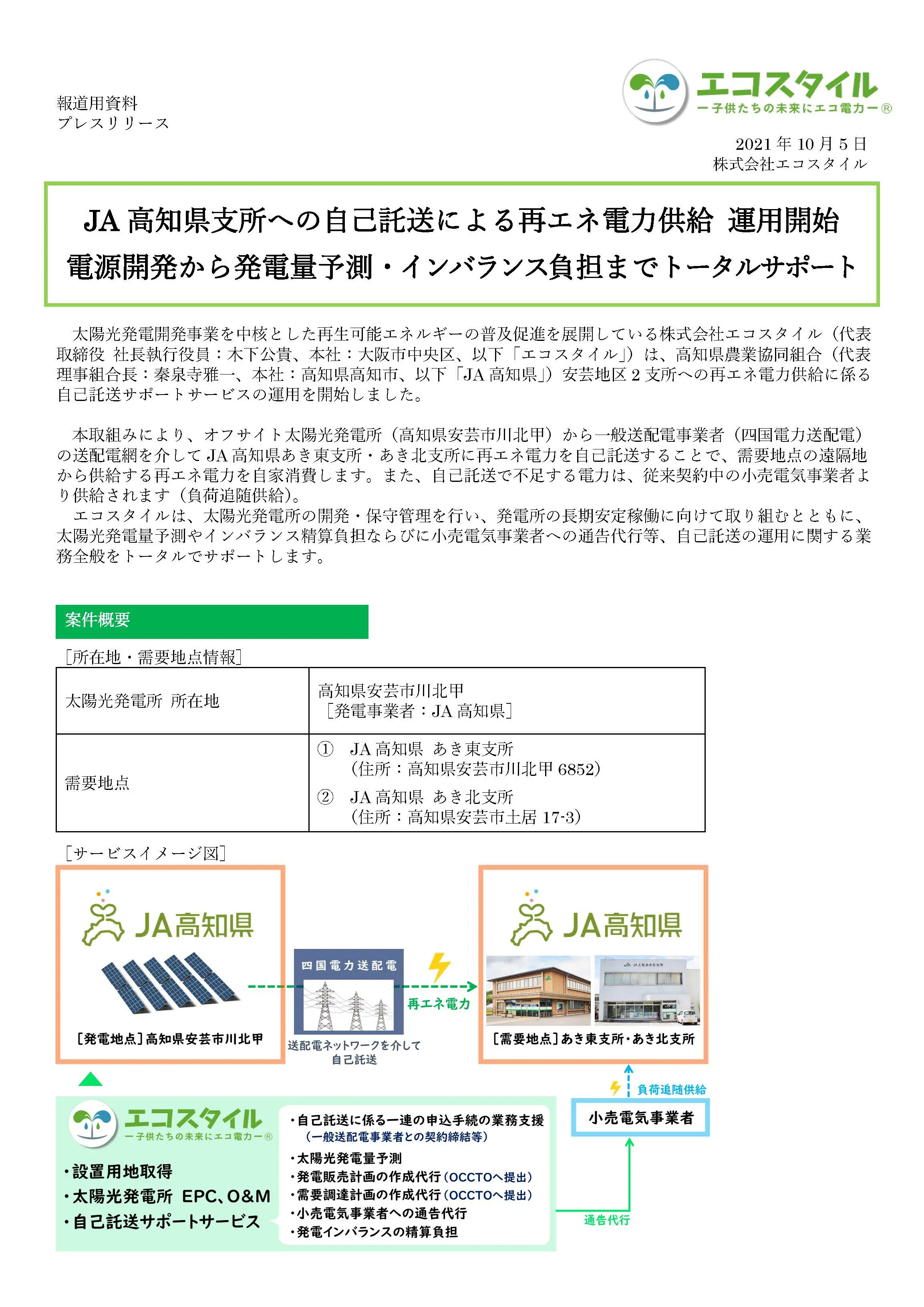 JA高知県支所への自己託送による再エネ電力供給 運用開始電源開発から発電量予測・インバランス負担までトータルサポート