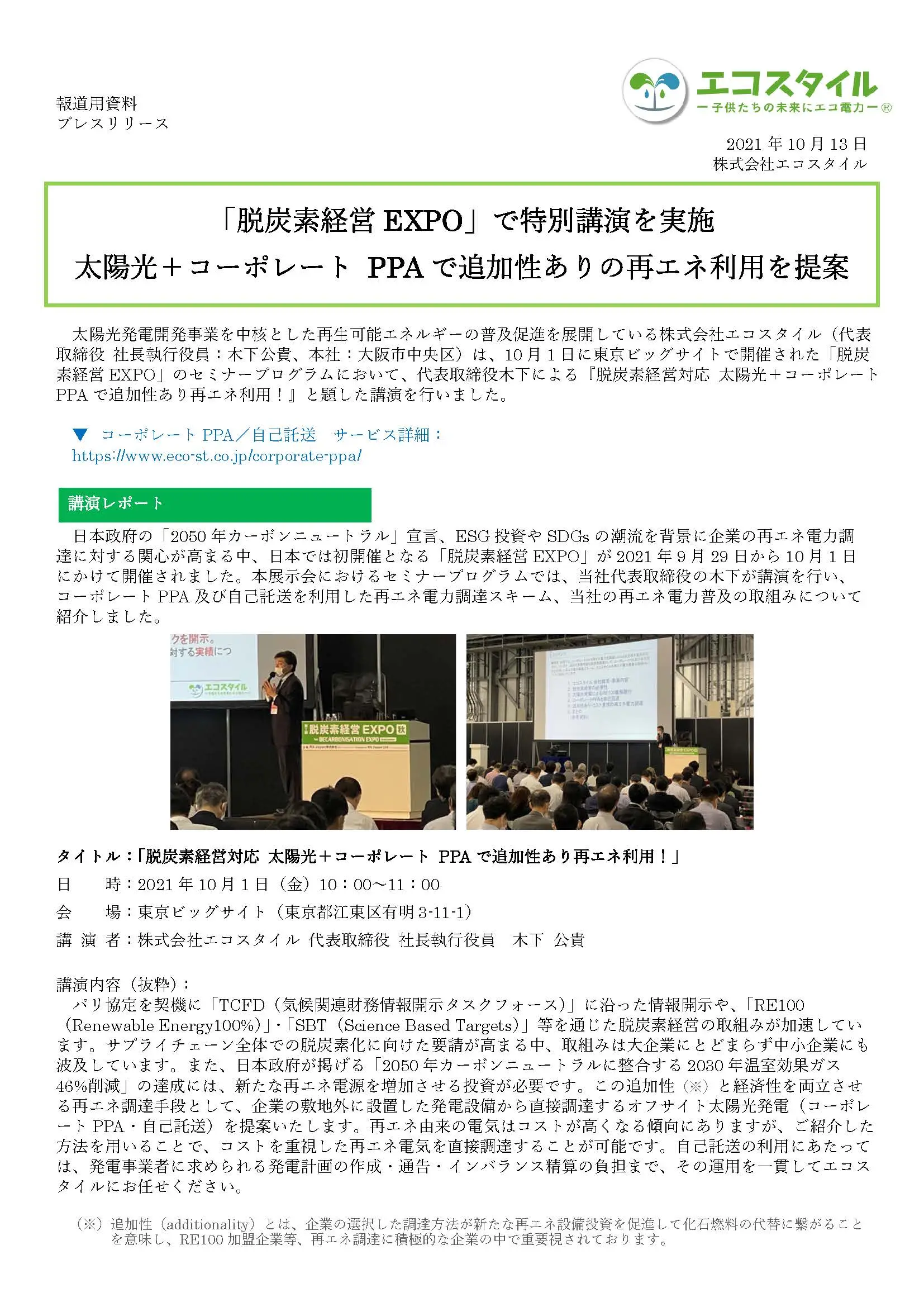 「脱炭素経営EXPO」で特別講演を実施 太陽光+コーポレート PPAで追加性ありの再エネ利用を提案