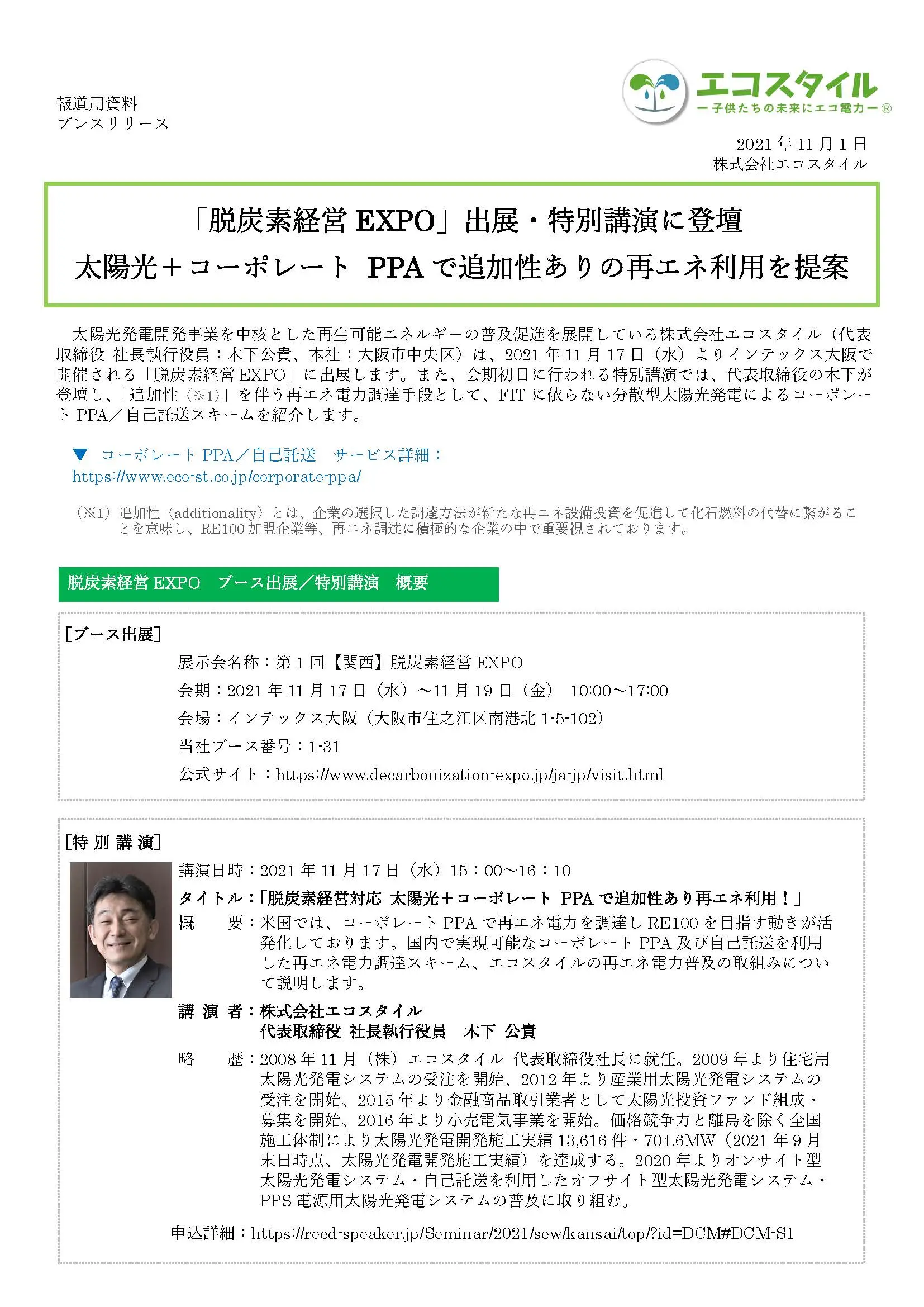 「脱炭素経営EXPO」出展・特別講演に登壇 太陽光+コーポレート PPAで追加性ありの再エネ利用を提案