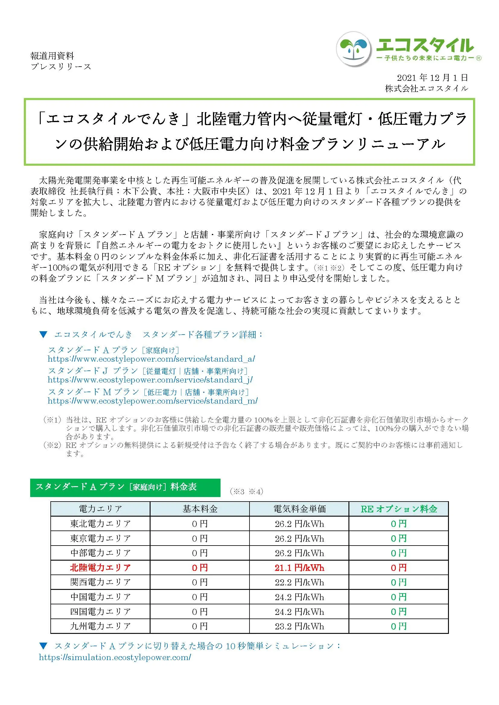 「エコスタイルでんき」北陸電力管内へ従量電灯・低圧電力プランの供給開始および低圧電力向け料金プランリニューアル