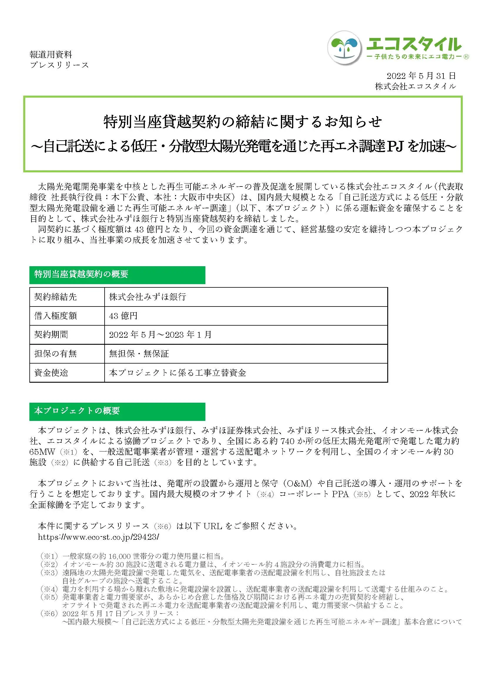 特別当座貸越契約の締結に関するお知らせ~自己託送による低圧・分散型太陽光発電を通じた再エネ調達PJを加速~