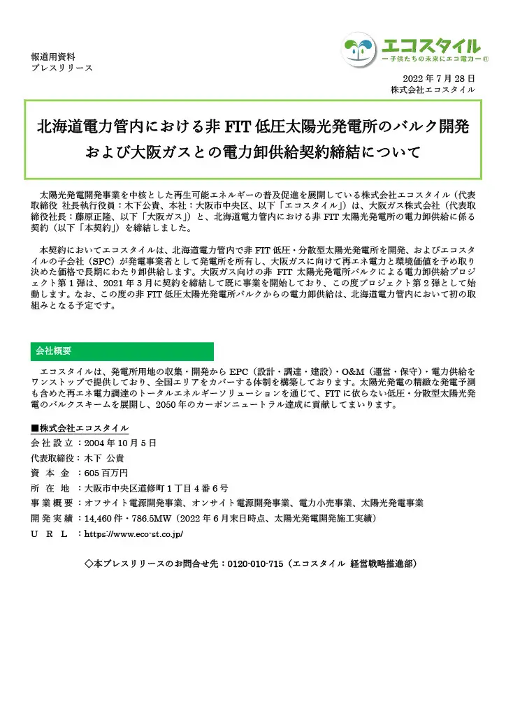 北海道電力管内における非FIT低圧太陽光発電所のバルク開発 および大阪ガスとの電力卸供給契約締結について