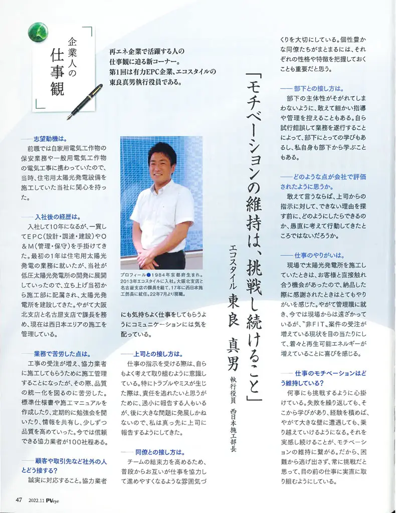 雑誌「PVeye 11月号 モチベーションの維持は、挑戦し続けること」(2022年10月25日発売)に、エコスタイル執行役員 東良部長の記事が掲載されました。