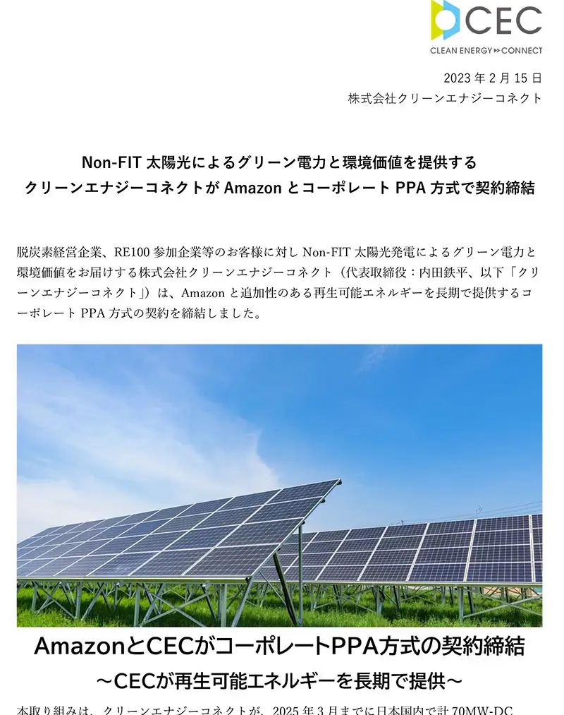 Non-FIT太陽光によるグリーン電力と環境価値を提供する株式会社クリーンエナジーコネクトがAmazonとコーポレートPPA方式で契約締結しました。