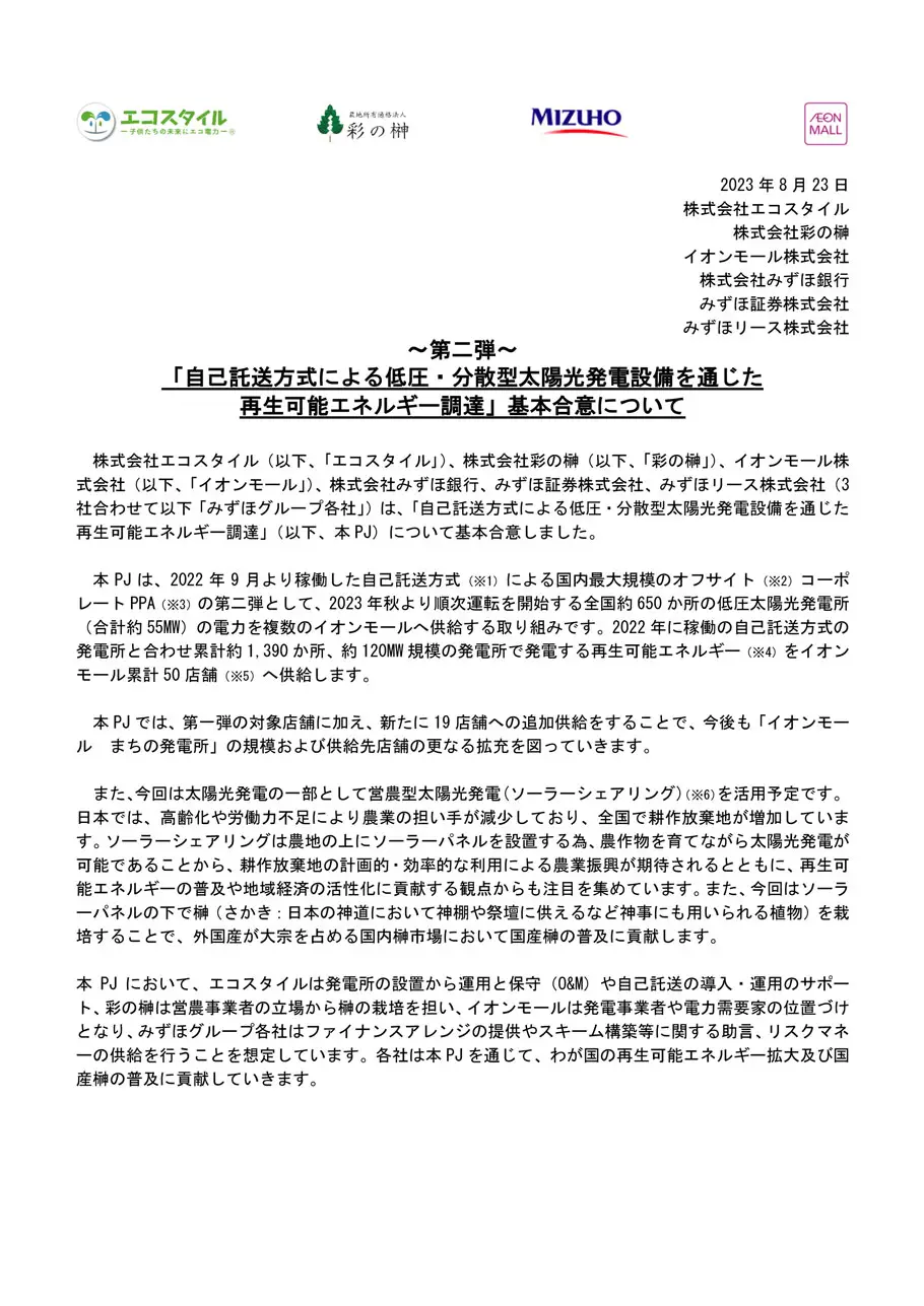 「自己託送方式による低圧・分散型太陽光発電設備を通じた再生可能エネルギー調達」基本合意について
