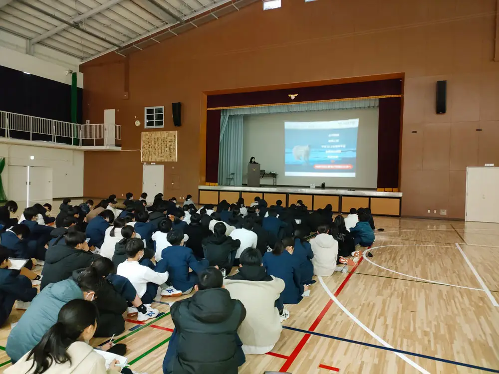 2月9日(金)に、吹田市立南千里中学校で、環境教育・キャリア教育の出張授業を実施しました。 「わたしたちを取り巻く環境・エネルギー」「将来に向けたビジネスマナー」をテーマに50分の講演を行い、地球温暖化の仕組みや、当社の再生可能エネルギー普及・促進の取組みについても紹介しました。 2年生125人に、SDGsにも大きく関わる環境問題や再生可能エネルギーについてや、また、ビジネスの場のみならず、日常生活にも活用でき、豊かな人間関係の形成にも役立つビジネスマナーのポイントについて学んでいただきました。